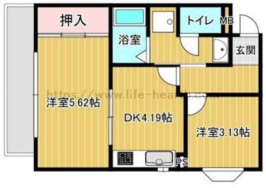 | 専有面積 | 37.54m2 ( 11.35坪 ) | 間取 | 2DK |