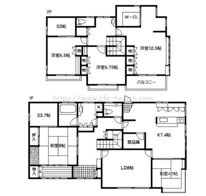 | 間取詳細 | (1階)LD8、(1階)K7.4、(1階)和8、(1階)納戸3.7、(2階)洋12.5、(2階)洋6.75、(2階)洋6.5、(2階)納戸3 |