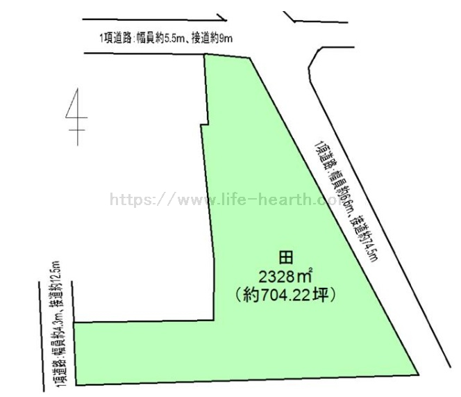 | 接道 | 北 5.5m(幅員) 公道 9m(接面) 東 6.6m(幅員) 公道 74.5m(接面) 西 4.3m(幅員) 公道 12.5m(接面) |